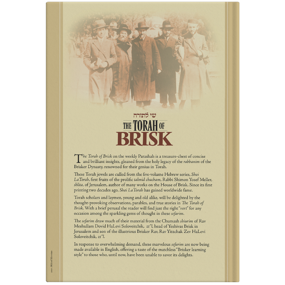 The Torah of Brisk on the weekly Parashah is a treasure-chest of concise and brilliant insights, gleaned from the holy legacy of the rabbanim of the Brisker Dynasty, renowned for their genius in Torah.